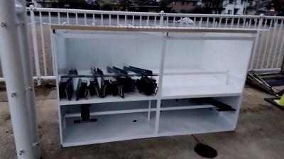 小松市内の陸上競技場では、スターティングブロック専用の置き場がなく、器具倉庫には他の備品と一緒に乱雑に置かれていました。そこで本校の課題研究で、陸上部の生徒が中心となった班でスターティングブロック専用の収納棚を製作しました。スターティングブロックが返却される際にばらばらにならないこと、3つのパーツを取り出しやすくすることを考える一方で、限られた時間で製作することも考えてシンプルに設計しました。
