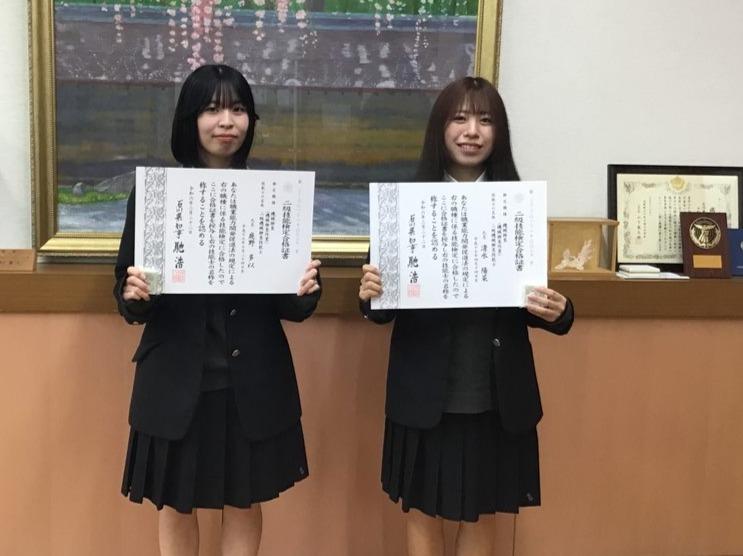 令和5年度技能検定において、令和6年3月に機械システム科を卒業した清水陽菜さん、庭野多以さんが在学中に県内女子生徒として初めて2級 機械検査作業に合格しました。