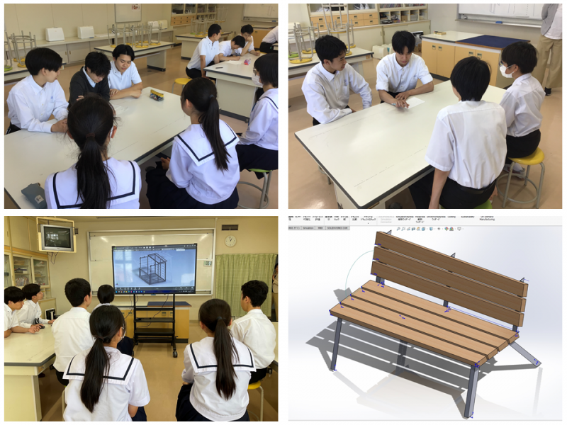 5月から中学校の生徒会メンバーと何度が打ち合わせをし、アンケートを実施、意見の集約を経てベンチ、ボールかご、給食ワゴンを製作することに決まりました。そこから、現状を確認し、意見や要望を取り入れながら3Dモデルを作成、7月には3Dモデルを使って芦城中学校でデザインレビューを行いました。年内の完成を目標に、夏休み中も設計を進め、9月から加工に取り掛かっていきます。