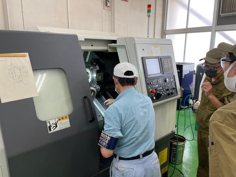 機械科(機械システム科)では、様々な工作機械を使った実習を行っています。この写真はプログラムを機械に入力すると、全自動で加工してくれる「数値制御旋盤」の実習風景です。