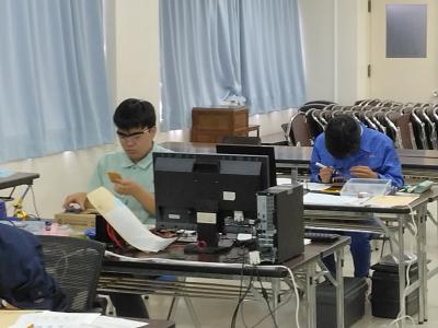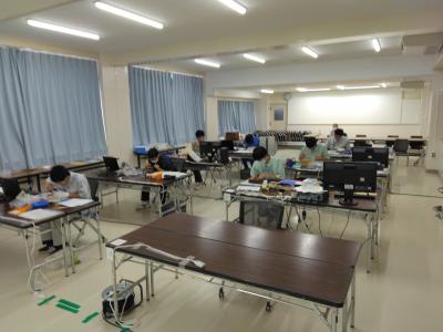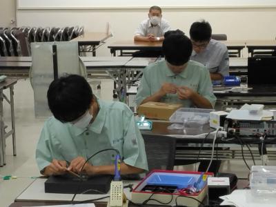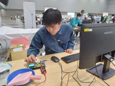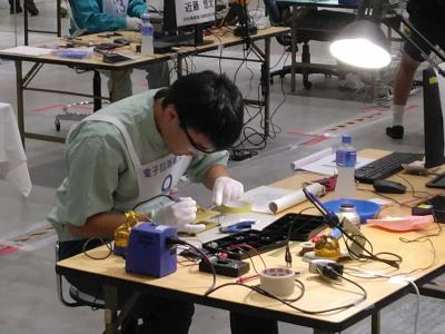 本校電気科2年永谷大峨選手は、競技時間4時間の前半のハードウエア(はんだ作業)は見事クリア、後半のソフトウエア(プログラミング)に果敢に挑戦しました。
