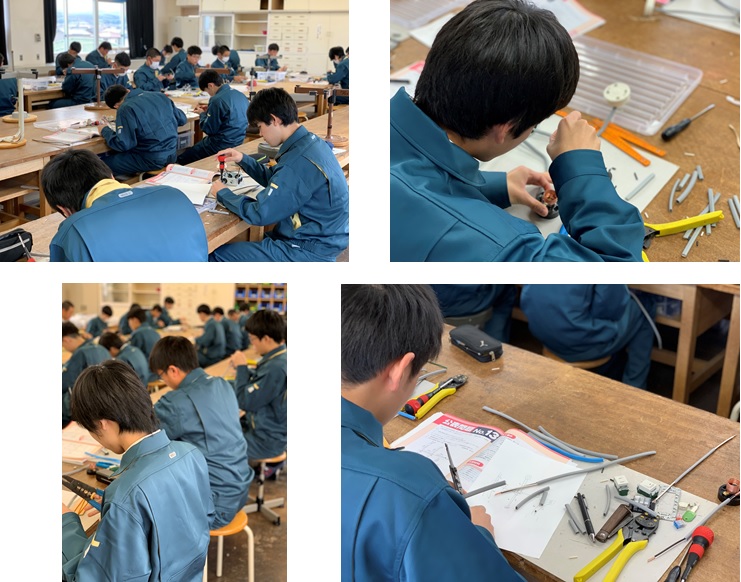 2023年12月21日 10時48分 住宅や学校、ビルの天井裏や壁の向こう側に敷設する電気配線作業に必要な資格(第2種電気工事士)の実技試験に向けて、今、電気科の生徒が一生懸命補習に取り組んでいます。