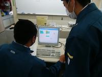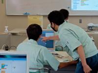 電気科2年生の実習の様子です。これまでアニメーションを使った簡単なゲームの制作や電子回路を制御するプログラムを楽しみながら学びました。今日は、電気技術者にとって必須知識である3相交流波形を描写するプログラムを考えました。生徒が先生役になって学び合う場面もありました。