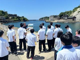 福浦港では写真を使った説明に加え、護岸の擁壁が海側に倒れているのを見ることができました。