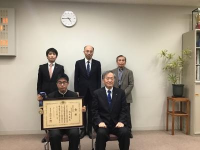 高校生ものづくりコンテスト 旋盤作業部門 全国大会優勝の報告のため、本校機械システム科3年 西手秀志君、部活動外部指導者の細川輝一さん、機械システム科佐藤宏樹教諭と一緒に北野教育長を訪問しました。