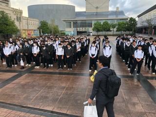 ホテルへ別途送る荷物を朝7時までにトラックに積み込むことになっていて、6時半ころには約半分くらいの生徒が積み込みを終えていました。この頃にはありがたいことに小雨が止み、屋根のある場所から出て駅前の広場で待機することができ助かりました。その後諸注意を行い、余裕を持ってホームへ移動を開始しましたが、最後のクラスが構内に入ったあたりで再び雨が降り出しました。非常にツイています。10月13日に帰ってくるまで天候が味方してくれることを祈っています。