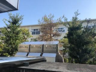 A棟とB棟の間の中庭には松の木が何本か植えられていますが、その中の数本に5月の初旬に毛虫がついたので、その後消毒をしました。その松の木ですがようやく新しい葉が生え始めたようです。毎日見ていると気づきにくいのですが、丸坊主同然から少し緑が目立つようになってきました。少しの食害は自然の摂理、生態系の一部と言えなくはありません。しかしほとんど葉を失うような食害は木にとって決して良いこととは思えません。また、万が一生徒が毛虫に触れてしまうようなことがあると困ります。子供のころ誤って手で触れてしまい手が腫れあがった記憶があり、確かとても痛いはずです。
