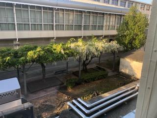藤の花は条件が良ければ1カ月くらいは持つとのことですので、保護者の皆様で、5/13のPTA総会等にいらっしゃる予定の方はぜひ中庭に出てご覧ください。