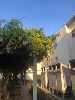 藤の花は、紫色や白色、ピンク色などの美しい色合いの花を咲かせるつる性植物です。芦城公園にも見事な藤棚がありますが、本校にも紫と白の藤が数本あり、夏は日差しを遮って心地よい日陰を作ってくれると思います。
