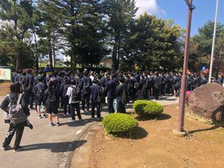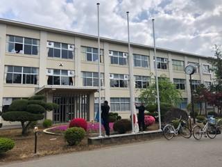 本校の正面玄関前にある国旗等は野球部の部員が毎日上げ下げしてくれています。今日は朝の打ち合わせが早く終わりタイミングが良かったので、感謝を伝え、写真を撮らせてもらいました。