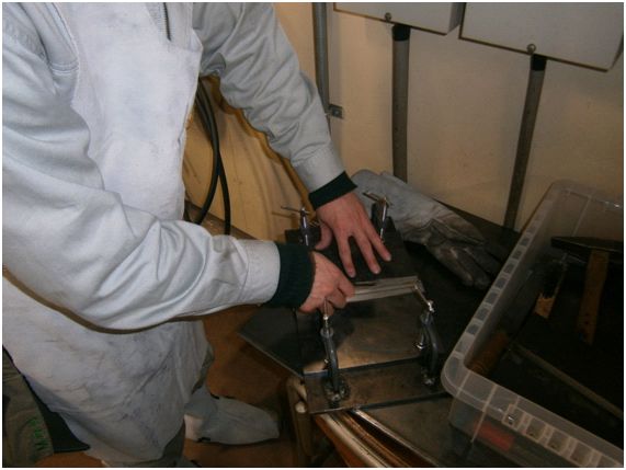 半自動溶接機で厚板9mmを1時間以内、薄板厚さ3.2mmを30分以内に溶接し、審査員による採点を行い、順位を決めます。