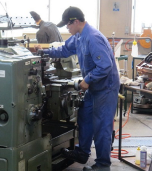 旋盤作業部門では旋盤という工作機械を使用し、炭素鋼の円柱を指定の寸法に削り出したり、ねじを切ったりして、その精度・ねじのはめ合い等を競います。