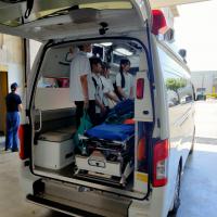 その後外に出て、小松工業高校の卒業生を含む大勢の隊員の方々から、消防車や救急車についての説明や、色々な体験をさせて頂きました。