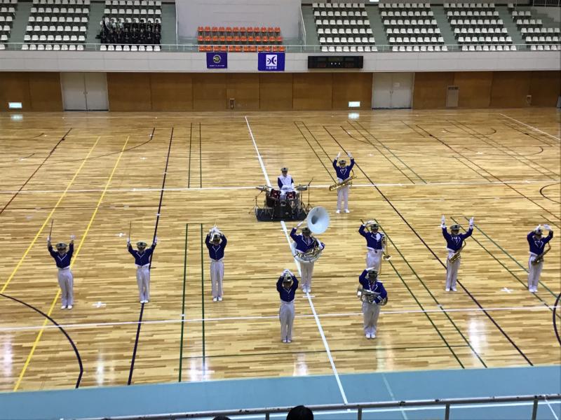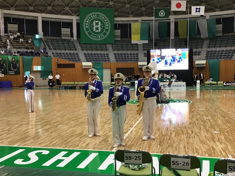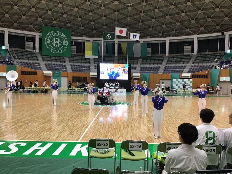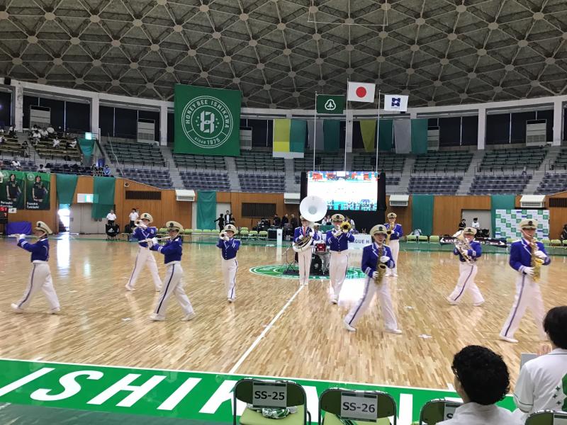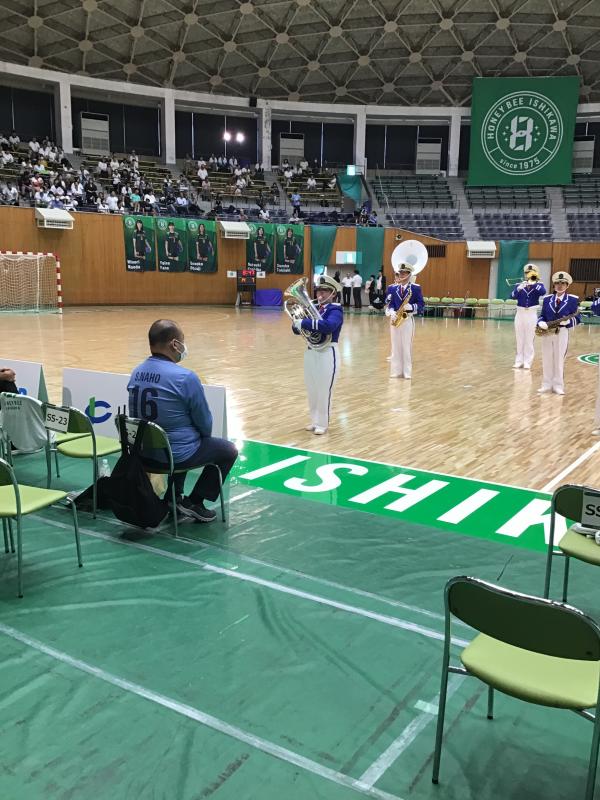 9月21日 小松市運動公園末広体育館のリニューアルオープンでのハンドボールリーグ戦(ハニービー石川)の試合におけるハーフタイムでマーチングを披露しました。