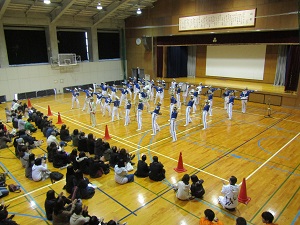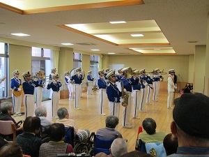 1・2年生のみで初めての本番演奏です。当初は駐車場での演奏予定でしたが、外の寒さも厳しく、室内での演奏となりました。入所者の方々から温かい声援をいただきました。