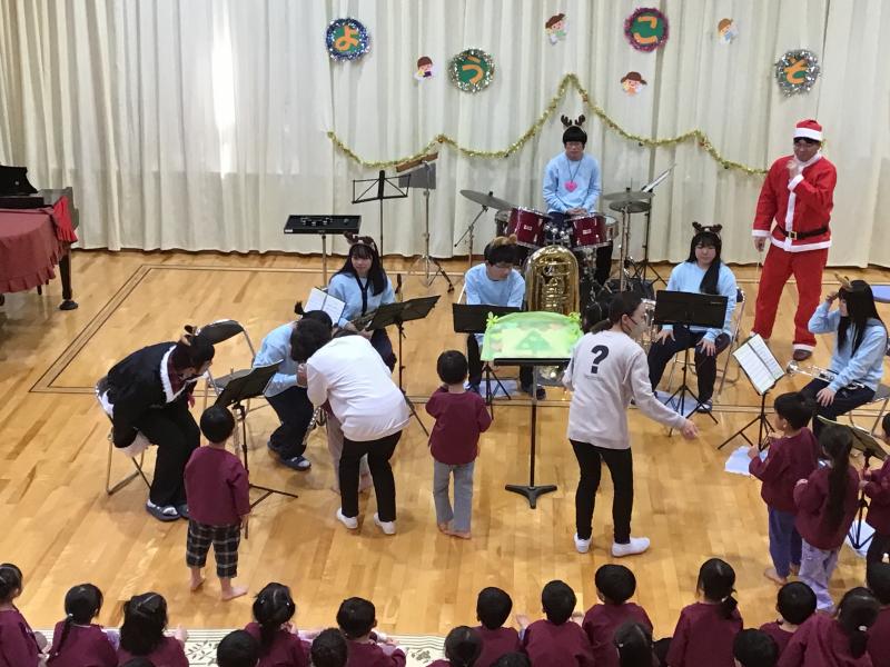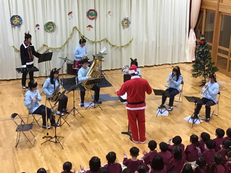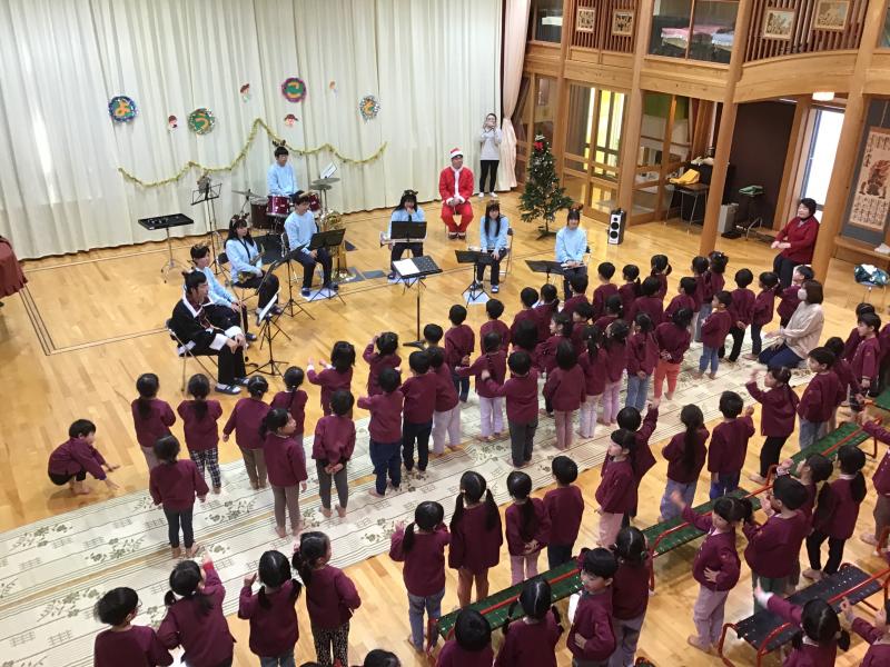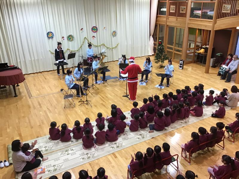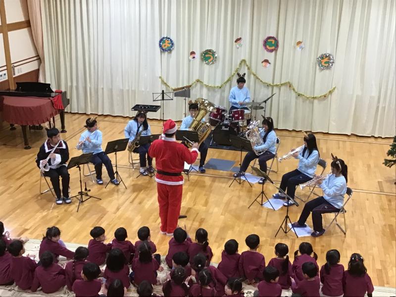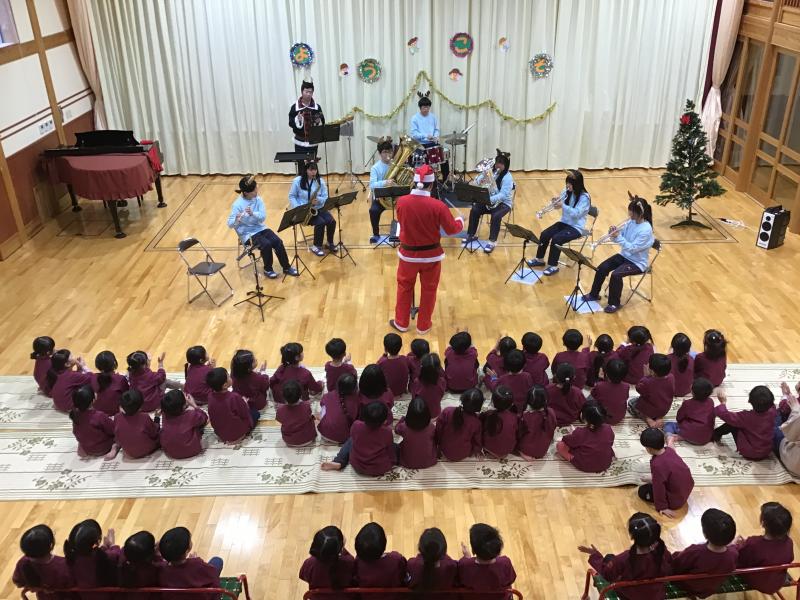 12月19日(木) 11時より小松市上小松町のこばと保育園にて訪問演奏を行いました。園児も楽しめるクリスマス曲やアニメ曲などを中心に演奏し、園児が知っている曲では、曲に合わせて歌っている様子がとても印象的でした。曲の間には楽器紹介も入れる中、園児の分かる楽器も沢山あり和やかな時間を過ごしました。チューバとユーフォニアムは園児も知らず、実際に音を聞いて楽器の名前を2つ新しく覚えたのではないでしょうか。私たちの演奏が終わるやいなやにアンコールと大きな声で言っていただきました。