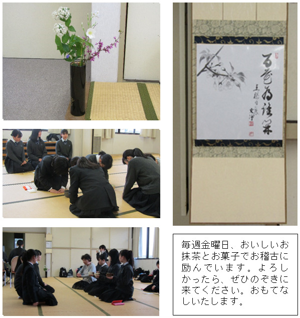 本年度も本田先生、田中先生のご指導の下、同窓会館2階で活動しています。1年生5人を新たに迎え、11名でお稽古に励んでいます。裏千家の一通りの点前を覚えることはもちろんですが、礼儀作法、季節の風物や、日本古来の文化についての知識を深め、学んでいます。