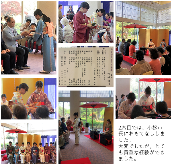 5 月3日小松市が主催する『ふじむらさきの茶会』に参加しました。令和の新元号を記念し、祝いの意をこめ、着物を身にまとい、小松商業、小松工業、小松市立の3校が協力してお抹茶とお菓子でおもてなしいたしました。