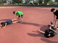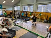 普段慣れないトレーニングに苦戦しながら、一生懸命に取り組みました。また、大人数でのトレーニングもとても良い刺激になりました。トレーニングの最後に、陸上部の投擲ブロックと重り押しダッシュも行いました。