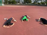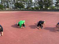 報告が遅くなりましたが、県総体後の6月7日に陸上部の練習にお邪魔してダッシュやインナーマッスルのトレーニングを習いに行きました。ウエイトリフティングは腕力が重視されがちですが、脚力や体をコントロールすることはとても重要です。また、普段のバーベルのトレーニングではアウター主体になってしまいます。インナーがあってアウターを支えるので、とても重要な役割があります。