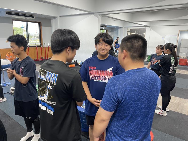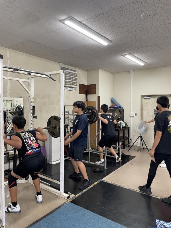 この夏は、全国的に猛暑が続いていますので、暑さ対策として冷房の効いた小松市総合体育館トレーニングルームで練習も定期的に行っています。こういった機会を利用して、追い込んだり、また普段できないようなトレーニングマシンで鍛えたりしています。また、公共の施設をマナー良く使用したり、一般利用されている方とコミュニケーションを取ったり、普段の学校の練習では体験できないことも勉強になっています。ウエイトリフティングをきっかけに生涯にわたって体を鍛えることも続けてほしいと思います。卒業後もウエイトリフティングやトレーニングを続けていく部員が一人でも多くなればと思います。筋トレ最高!!