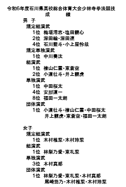 令和6年度石川県高校総合体育大会少林寺拳法競技