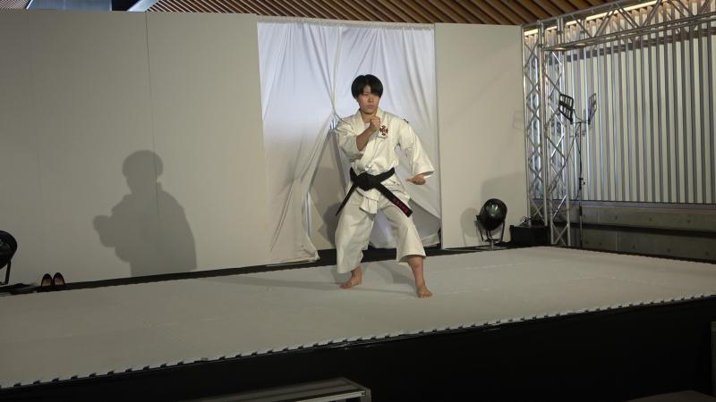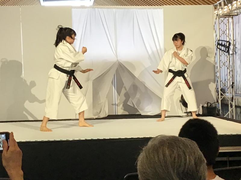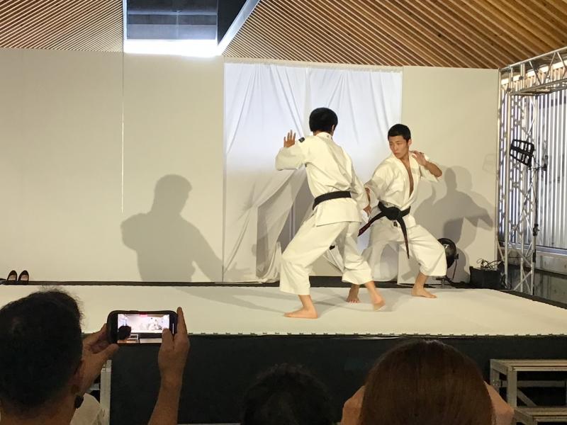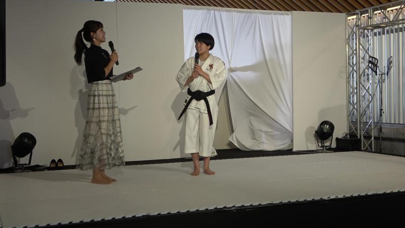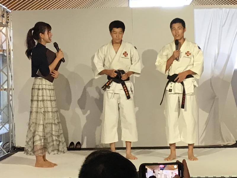 9月18日 小松駅高架下に小松市観光交流センター(Komatsu九)がオープ 最初に組手の披露を行い、女子単独演武、女子組演武、男子組演武を行った。 それぞれの演武終了後に司会者からのインタビューもあった。部員は緊張の中、一生懸命答えていたのが印象的でした。