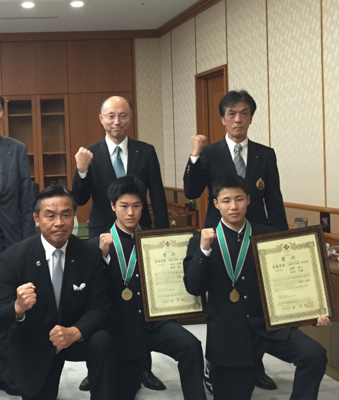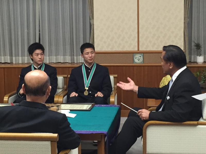 10月30日(月)に少林寺拳法世界大会で一般男子初段(組演武)において、最優秀賞に輝いた深澤遥仁、池田亘輝が県知事を表敬訪問して、世界一になった報告をした。