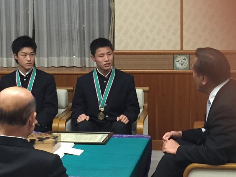 今年3月に香川県で開催された全国高校少林寺拳法選抜大会の男子規定組演武で優勝した本校少林寺拳法部の池田亘輝選手と深沢遥仁選手らが馳浩県知事を表敬訪問しました。