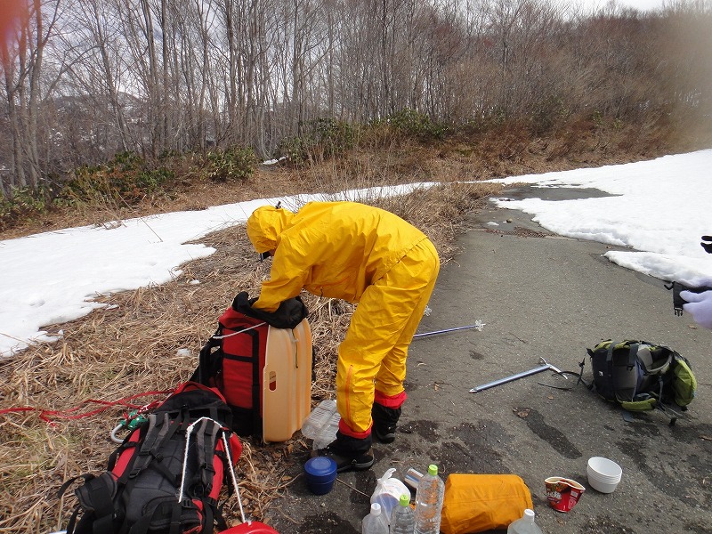 昼飯を食べ終わって、いざ滑落訓練!ストックを使って滑落を止めます。