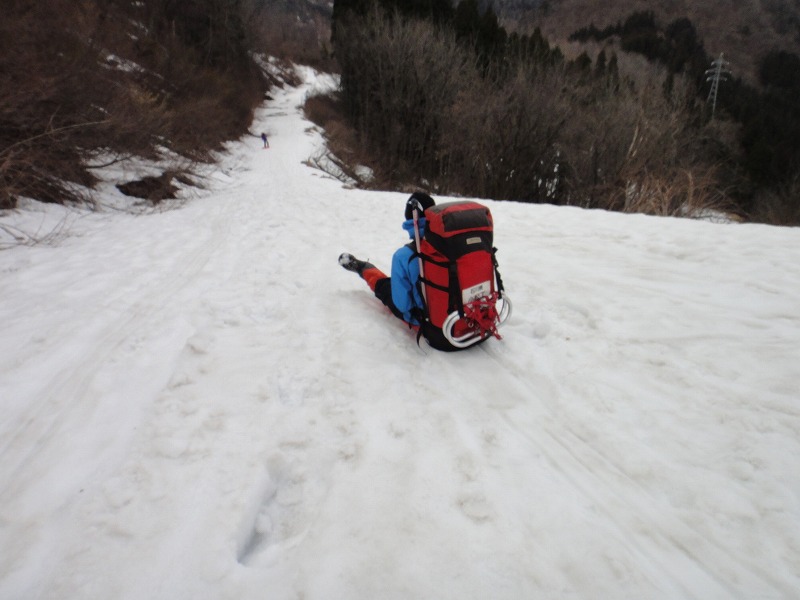 帰りはソリで滑走しました。雪が少ないおかげで藪が出でいてソリがしにくいです。