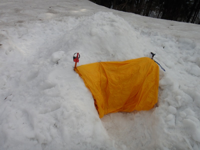 下山後テント場に戻ってきて、かまくらを再建しています。2人が横になって寝れる程度の広さになったので、実際に泊まってみます。ツエルトという簡易テントを風しのぎにします。先に感想を述べると、普通に寒かったです。