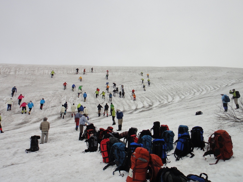 皆で、雪渓を登っています。工業は、一番右のきつい傾斜に挑戦中です。