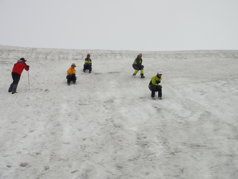 工業のA隊4人でグリセードをしているところです。他校にもピッケルを貸してみんなで楽しみました。
