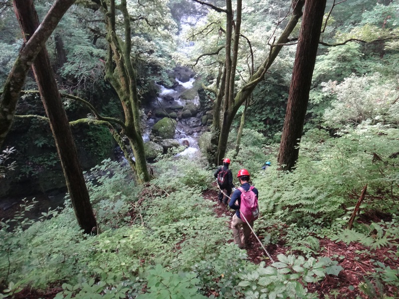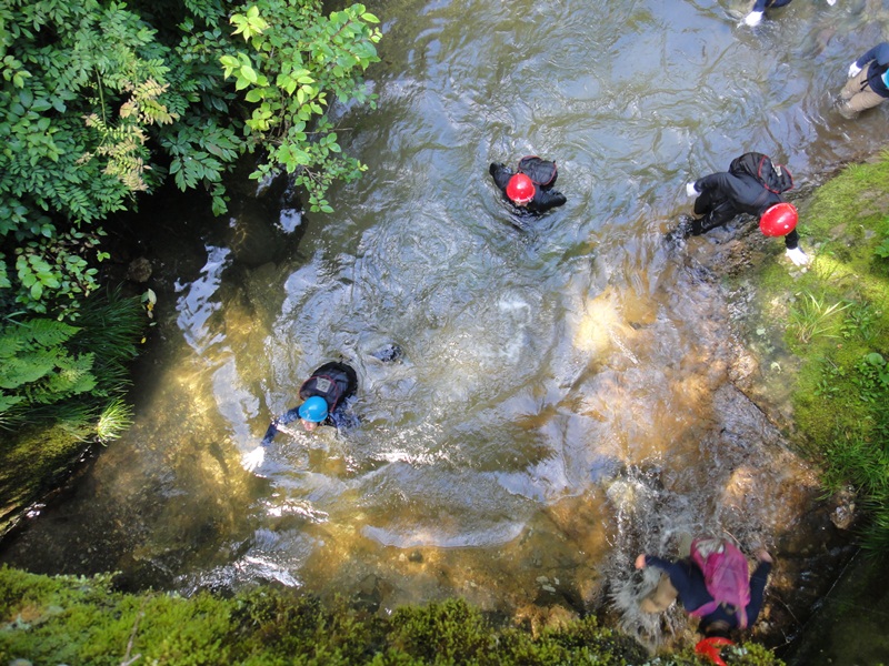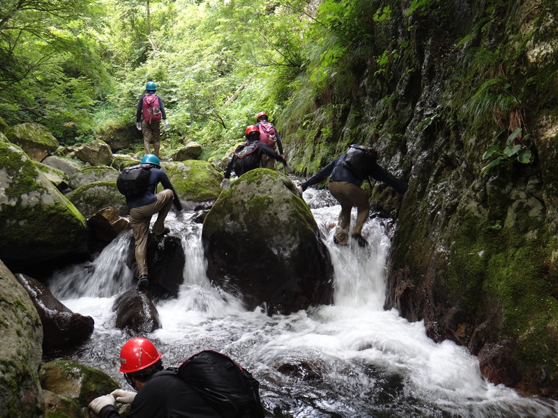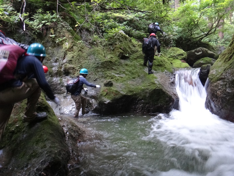 ヘルメット、沢足袋を装着してさぁ沢登。