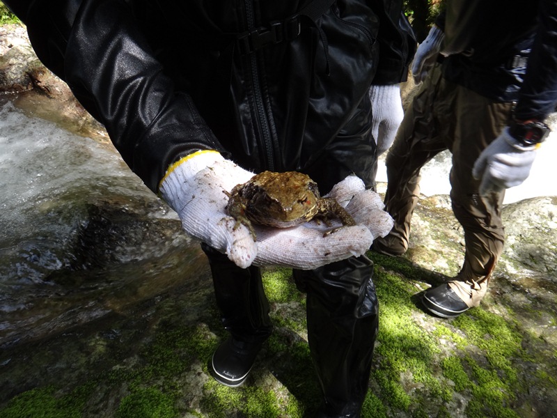 もう少し暑くてもよかったという人もいましたが天気は良かったので増水するもなく無事沢登は終了。途中でこんなにでかいカエルを一年生が捕まえました。一年生は自然が大好きみたいです。