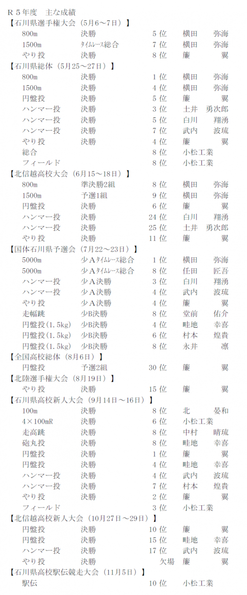陸上競技は個人競技ですが、小松工陸上部はチームで活動しています。個々の競技レベルは違いますが、部員全員が大幅な自己記録の更新を目指し、インターハイ、北信越大会など上位大会に進出できるよう日々活動しています。また、部活動を通して、競技力の向上のみならず、団結力や協調性を身につけ、社会で通用する人間形成も目指します。