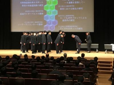 今年度は、石川県の工業部会会員校の各科代表6チームと本校姉妹校である高知県立高知工業高校の代表チームが工夫を凝らした課題研究の成果を発表しました。高知工業高校と本校とは、1年交代で代表者がそれぞれの学校を訪問し、課題研究の発表を行っています。