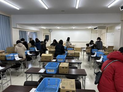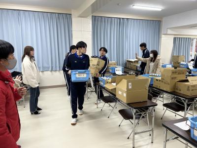 PTA役員、企画委員の方々が中心となり、お菓子袋とお茶をクラスごとに仕分けし、全生徒へ配付しました。