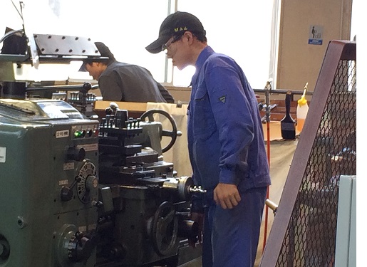 旋盤作業部門では旋盤という工作機械を使用し、炭素鋼の円柱を指定の寸法に削り出したり、ねじを切ったりして、その精度・ねじのはめ合い等を競います。