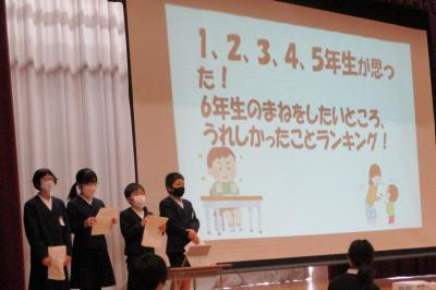 新型コロナ感染予防対策で、全校が集まることはできませんでしたが2部に分けて「6年生を送る会」が開かれました。5年生が中心となって、1年生から5年生までみんなで協力して準備をすすめてきました。小丸山小学校のすべての子供たちの心のこもった楽しい温かい会になりました。