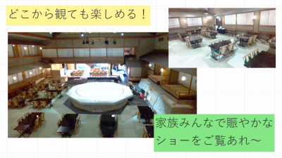 花舞茶寮(個室)、シアターダイニング饗では、御陣所太鼓などのショーを観ながら食事が楽しめます。
