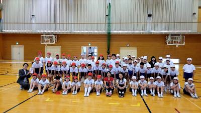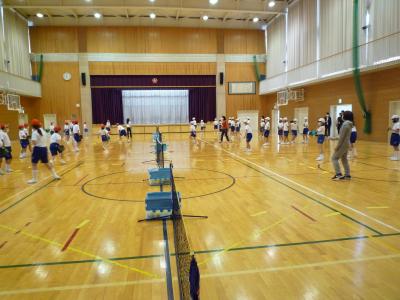 4月18日(月)能登和倉国際女子オープンテニスの関連行事として、小丸山小学校の5年生が「テニピン」を体験しました。講師には、元プロ選手の佐藤直子さんが来てくださいました。テニピンとは、易しさを追求して、用具とルールをアレンジしたテニス型ゲームです。ボールの打ち方を教わった後、ゲーム形式で楽しみました。また、一般財団法人 服部真二文化・スポーツ財団様からセイコースポーツカウンターを頂きました。
