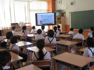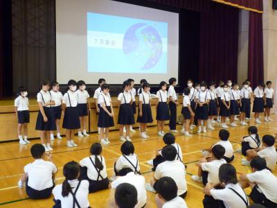 7月6日(木)半分の学級は体育館で、半分の学級は教室でリモートによる全校集会を行いました。その中で2年1組、4年1組、6年1組が「ふわふわ言葉ベスト7」を発表しました。どの学級も素敵な発表でした。