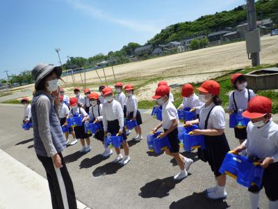 5月10日(火)1年生が生活科であさがおを植えました。今日は、さっそくお水をあげていました。芽が出るのが楽しみですね。