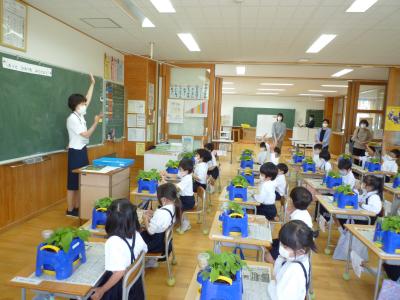 5月31日(火) 3月までお世話になった幼稚園、子ども園、幼保園の先生方が1年生の様子を見に来られました。生活科の授業でした。前半は5感を使ってあさがおを観察し絵にかき、後半は観察して見つけたことをお店やさんの形で伝え合いました。来て下さった先生方、ありがとうございました。