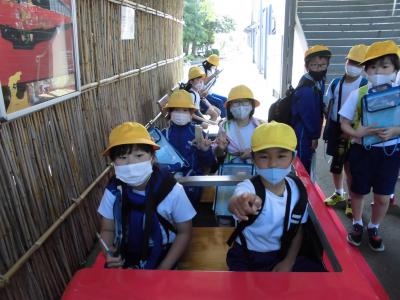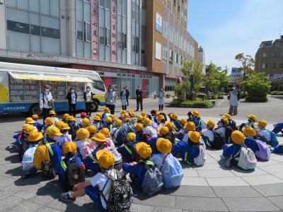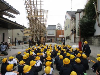 4月26日(火)3・4年生はでか山見学に御祓コミュニティセンターに出かけました。子供達は魚町でか山保存会メンバーの方に、でか山の大きさや重さ、使われている木の種類などを質問したり、てこに触らせてもらったりしました。