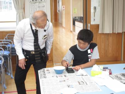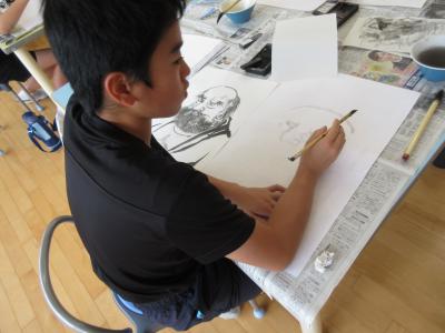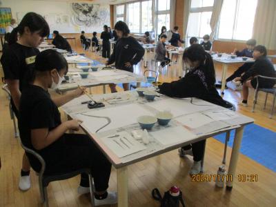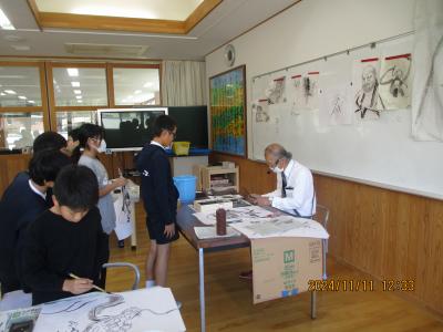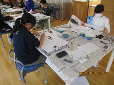 10月28日(月)と11月11日(月)元小丸山小学校校長の橋元道彦先生を講師にお迎えし、水墨画を習いました。墨すりから体験し作品を仕上げました。