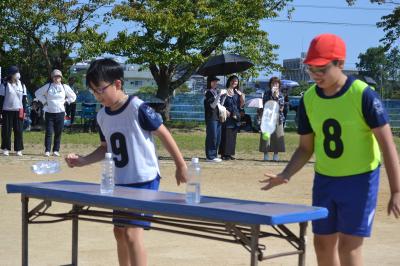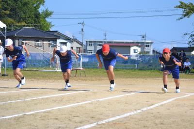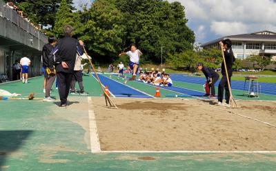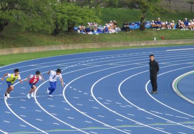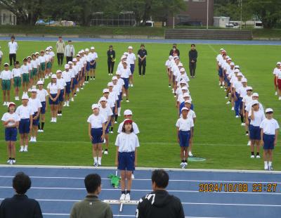 10月9日(水)グランドが新しく張り替えられた城山陸上競技場で七尾市の連合運動会がありました。100m走、幅跳び(選抜)、リレーが行われました。最後のリレーは雨が降ってきましたが、力いっぱい応援していました。