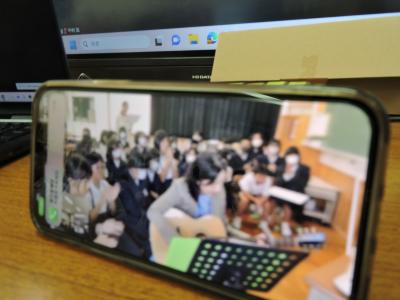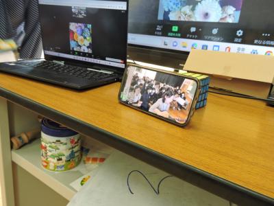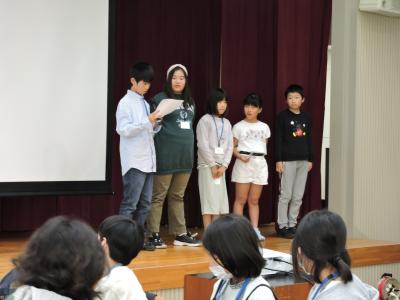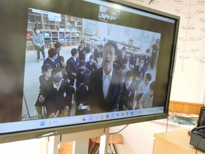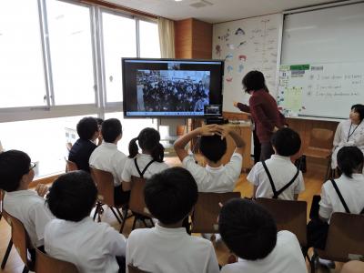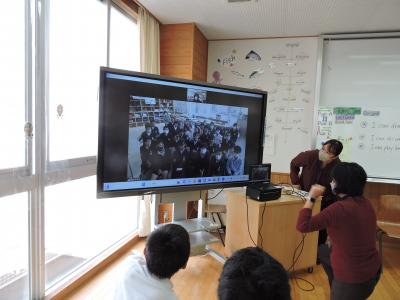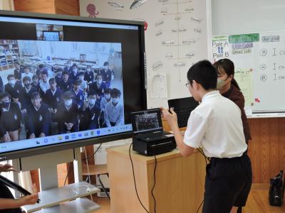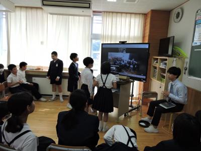 5年1組は東湊小学校の5年生と5年2組は朝日小学校の5年生と自分の学校紹介の英語交流をしました。